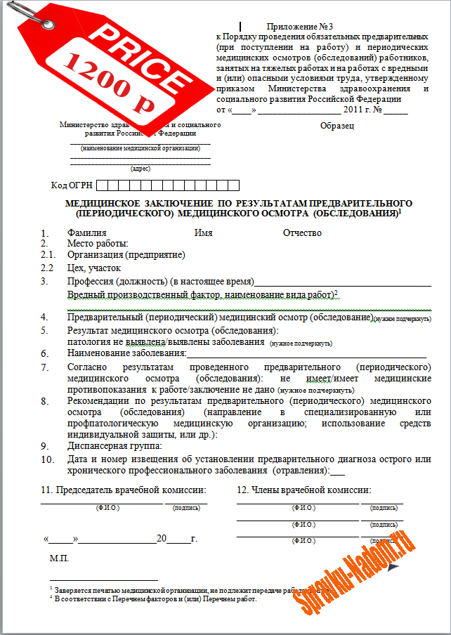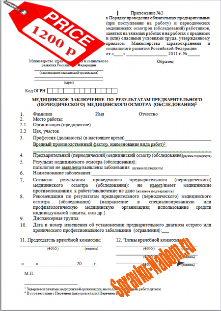 Особой формы заполнения справки не имеется. Если глянуть на образец 302н, то станет понятно, что из обязательного там только степень подлинности и способ заверения документа. Остальные графы могут быть заполнены в произвольной форме, главное чтобы сохранилась суть документа, а именно, каждый доктор дал свое заключение о состоянии здоровья пациента.